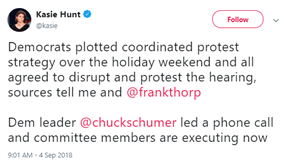 “So much in fact that at yesterday’s hearing, 70 people were arrested for their disruptions while the Democrat Senators interrupted more than 60 times. Apparently, this outrageous display of obstructionism was orchestrated during a weekend conference call with Democrat Senators plotting how they can best cause a scene.